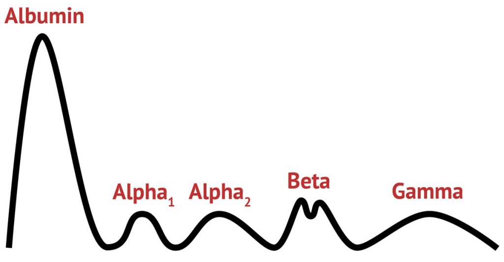• گاما گلوبولین: این پروتئین در بیماری‌های مولتیپل میلوما، رماتیسم مفاصل و لوپوس افزایش می‌یابد.کاهش گاما گلوبولین با اختلالات سیستم ایمنی همراه است.